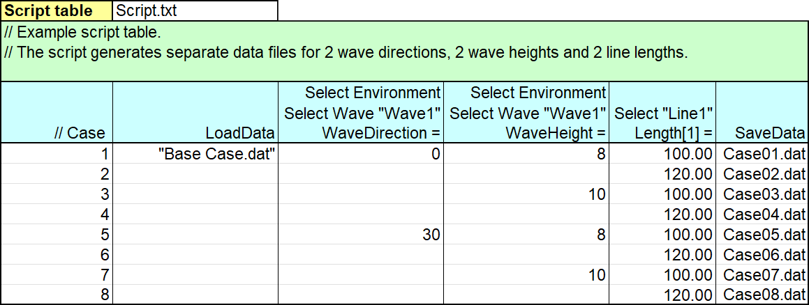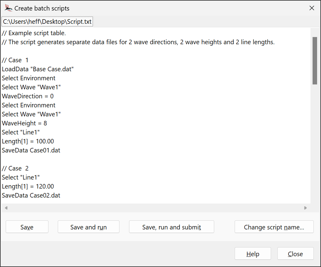 Warning: | Support for batch script is maintained solely for historical reasons. The preferred way to specify variations on a base data file is to use text data files, specifically variation models. The OrcaFlex spreadsheet offers a facility to generate these text data files. |