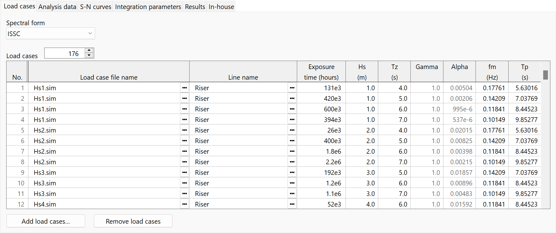 This wave scatter table gives 16 wave classes and so the fatigue analysis data in OrcaFlex would be set up with 16 corresponding load cases with appropriate pairs of $\Hs$ and $\Tz$ values.