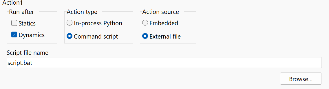 There are two types of post calculation action: in-process Python actions and command script actions.