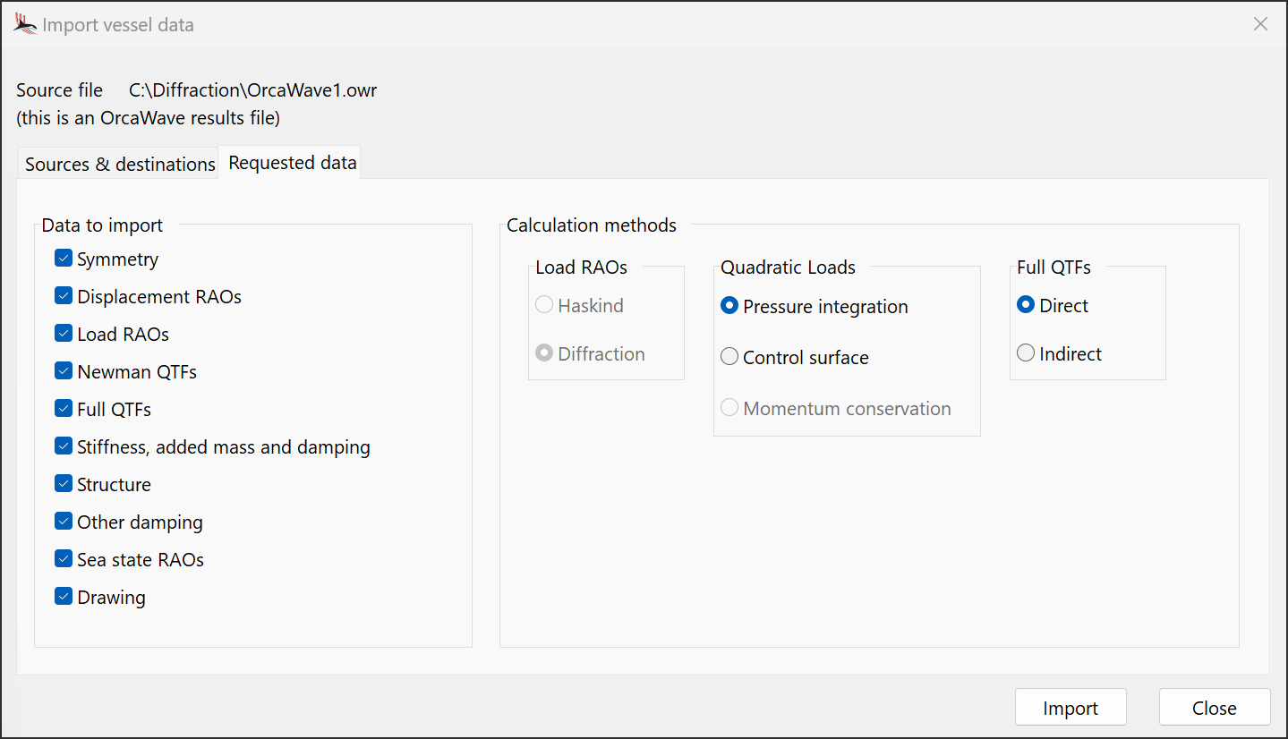 For some types of data (load RAOs, Newman QTFs, full QTFs), OrcaWave may offer results from various different calculation methods. The requested data page of the import vessel data form allows you to choose between the methods that are available in the .owr file you have selected, as illustrated in the following figure: