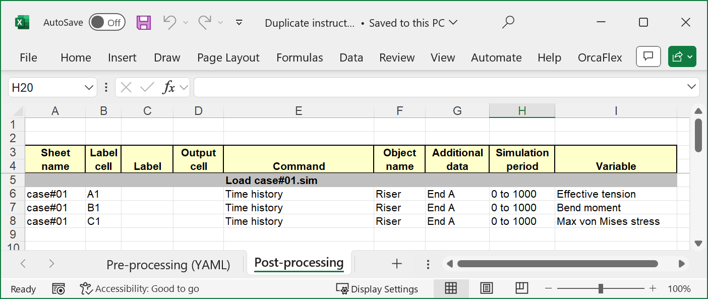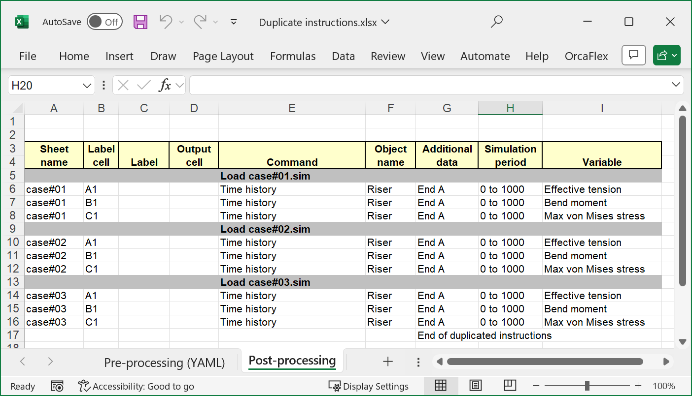 The duplicate instructions form can be found on the OrcaFlex tab of the Excel ribbon in an OrcaFlex spreadsheet. Before using it you should create a set of instructions for the first load case, as in this example: