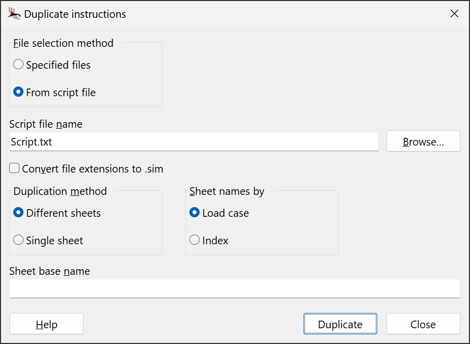 If you opt to convert file extensions to .sim then the file names for the duplicated load instructions will all be converted to have the .sim extension, irrespective of the file extensions of the specified files. This can be useful if you want to prepare post-processing instructions before the simulation files have been generated, and only have data files available.