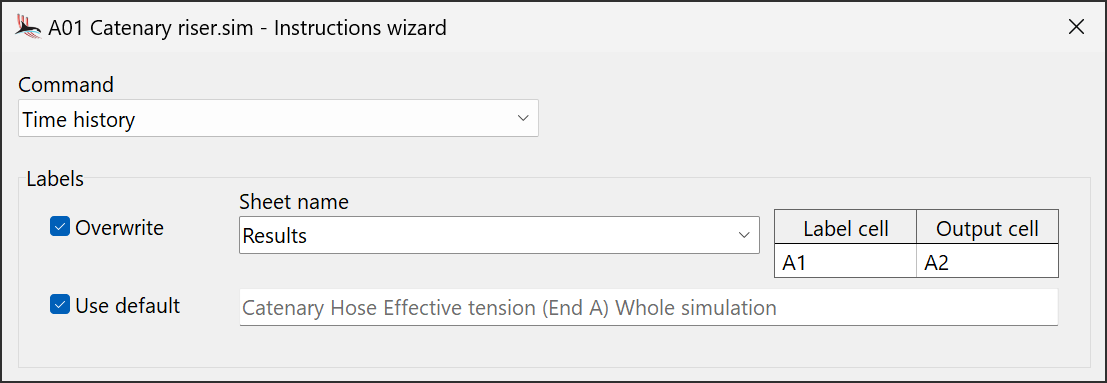 Now we need to add some more instructions which specify which results to extract from this simulation file. Open the instructions wizard again and select the Time history command. In the object list select an OrcaFlex line object (if you are using the A01 Catenary Riser example, select the Catenary Hose) and then select effective tension from the list of variables.