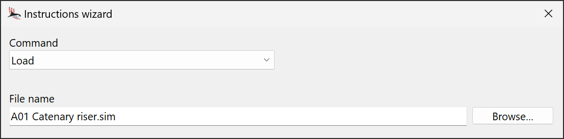 In the instructions wizard click the drop down button and select the Load command. A file name field and a browse button will now appear. Click the browse button and select the simulation file from the first part of this tutorial. The top part of the instructions wizard should now look something like this:
