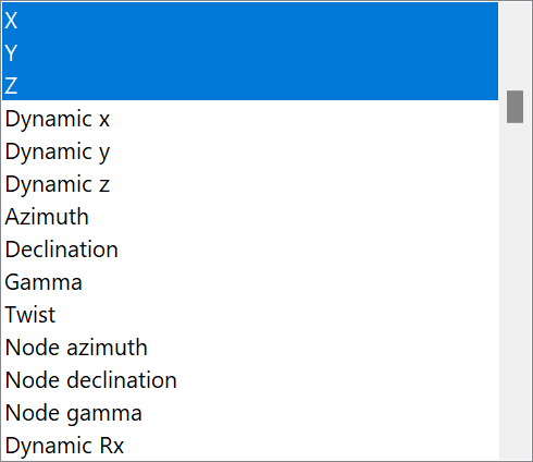 More than one instruction can be added at once. Suppose that you want time histories of X, Y and Z for the line. Select these from the variables list using CTRL+click or SHIFT+click. The variables list will look like this: