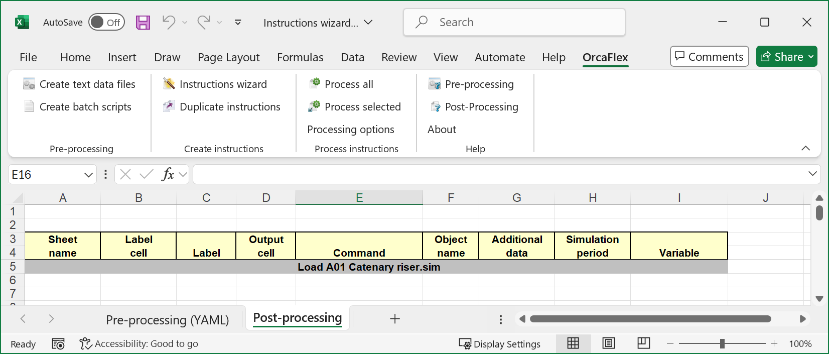 Now create an OrcaFlex spreadsheet and save it in the same directory as the simulation file. The spreadsheet should now looks like this: