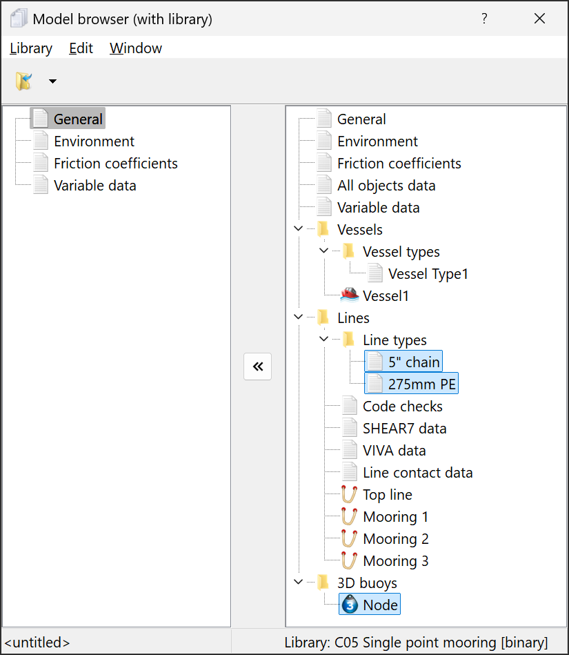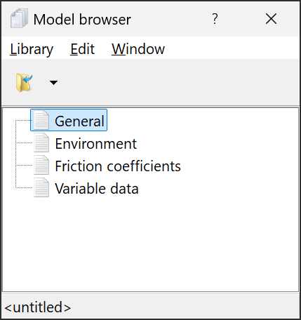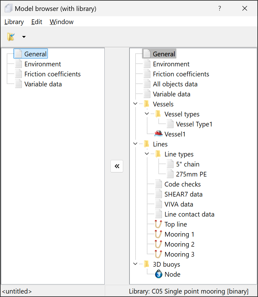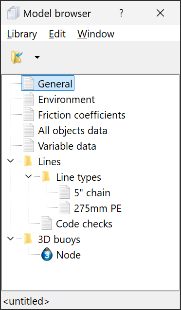 Libraries allow you to easily import objects from one OrcaFlex model to another. To do this run OrcaFlex and open the model browser by clicking the model browser button or the Model | Model browser menu item, or pressing F6. The model browser should look like this,