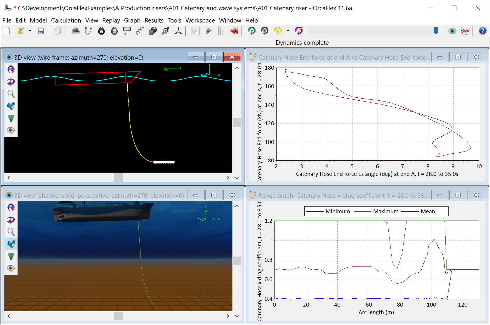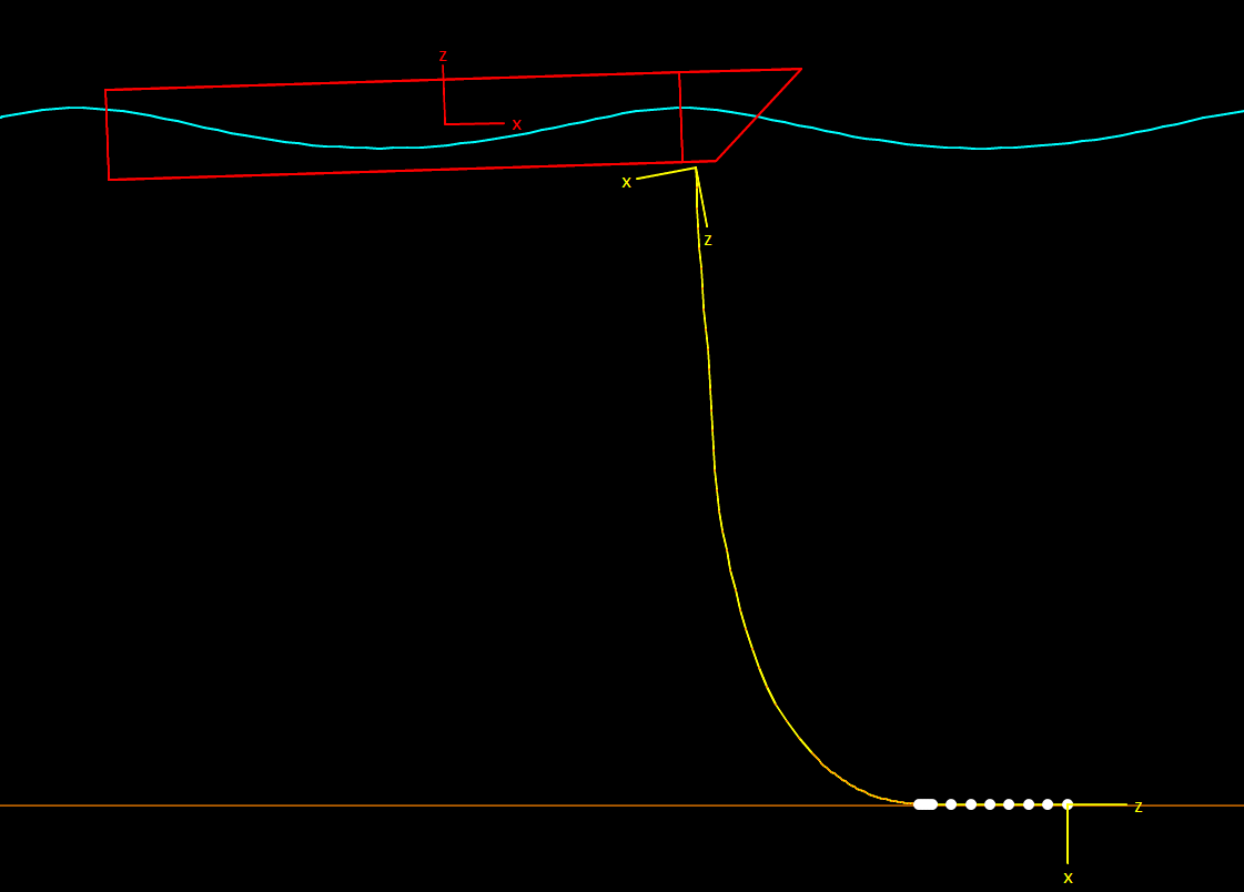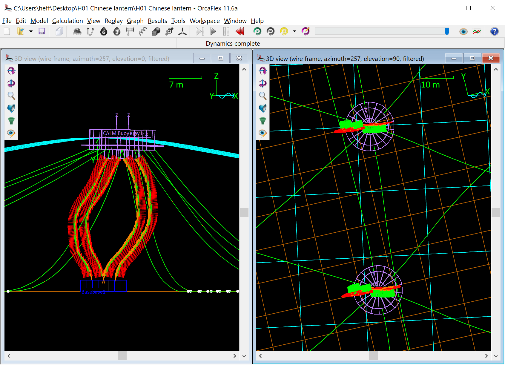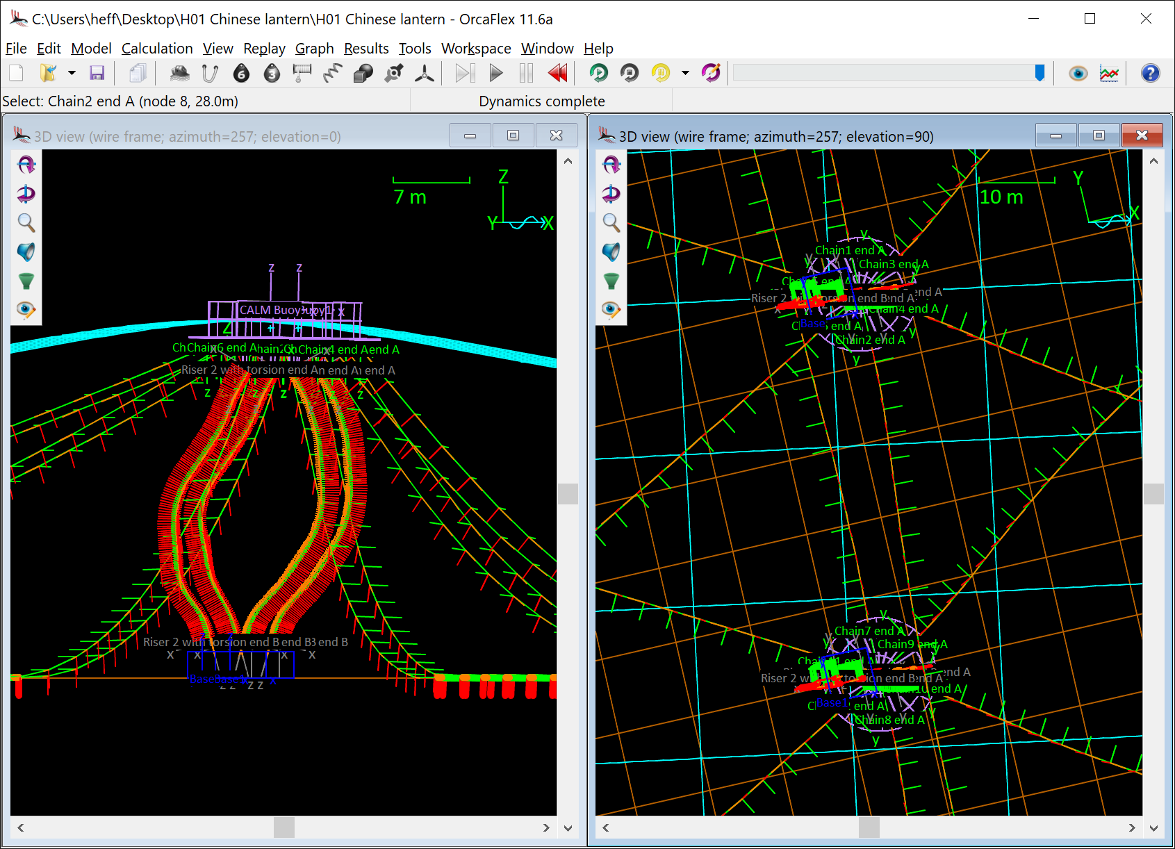 Suppose we are preparing a report to describe our approach to modelling CALM buoys. This model compares risers with and without torsion, so we will want to include node axes again. We also want to make the individual elements obvious to the reader without additional annotation, so we enable name labels. Further, rotations of the CALM buoys are interesting, so we're going to enable the local axis drawing. We'll produce some snapshots in elevation and plan views, which with all the global view settings applied looks like this: