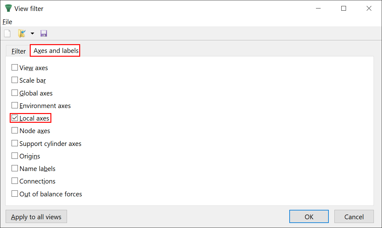 | Objects | Shown | Node axes | Local axes | Name labels |