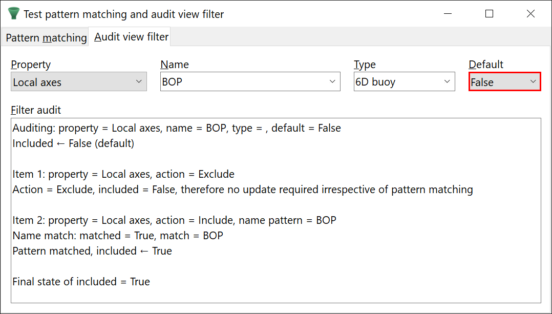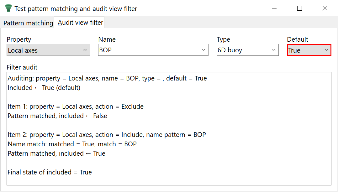 We are interested in the local axes property for the object named BOP. And we are trying to see the impact of using different default values, which for the local axes property means different values of the local axes preference. We can use the audit tool to compare the two paths through the filtering algorithm for the two possible values of this preference, true or false. The user has to set each of the four input fields, and then the audit is reported as text: