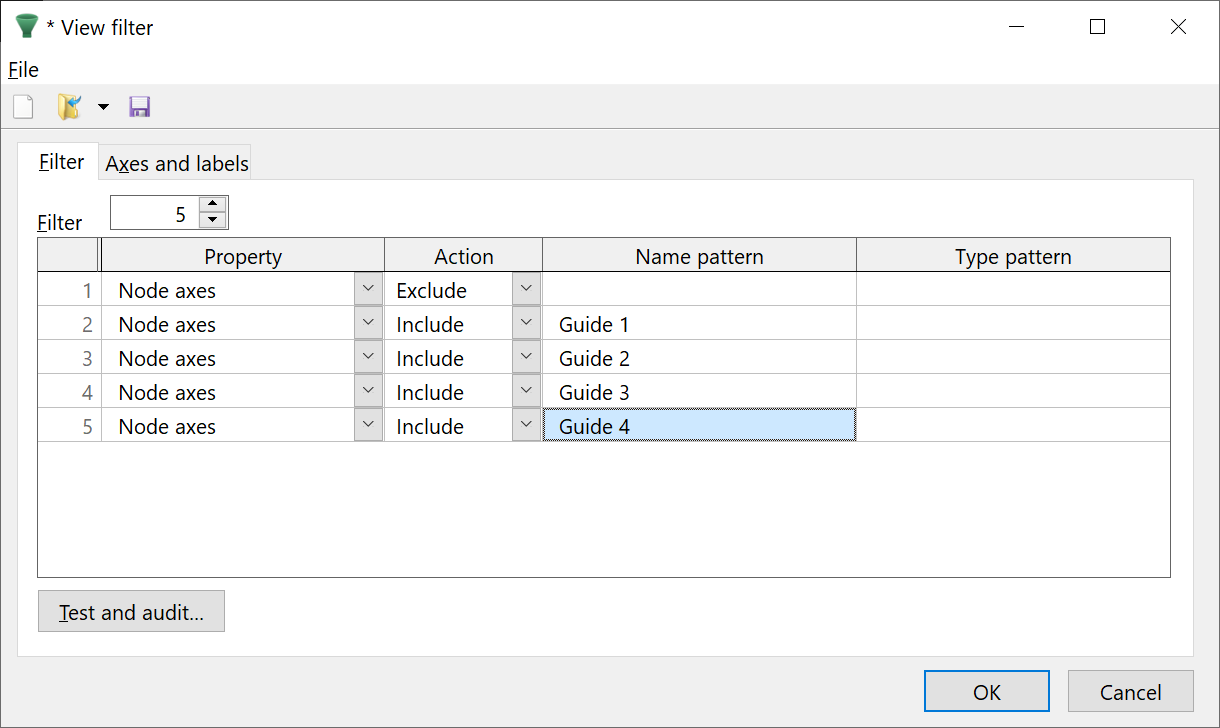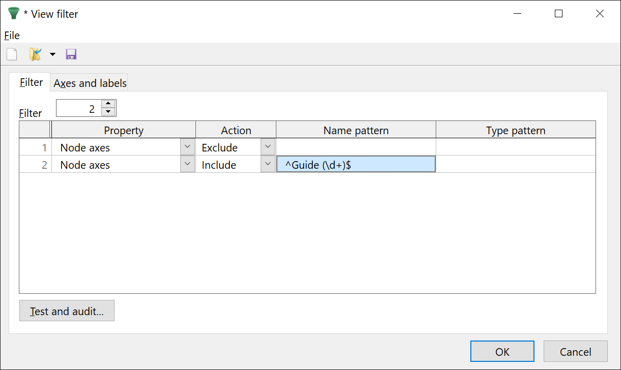 This is available by clicking the test and audit button on the view filter form. This has pages for testing pattern matching, and auditing the filter. We are going to look at the audit filter page. The audit tool allows you to debug and inspect, step by step, how the filtering algorithm is applied to a specific property and object.