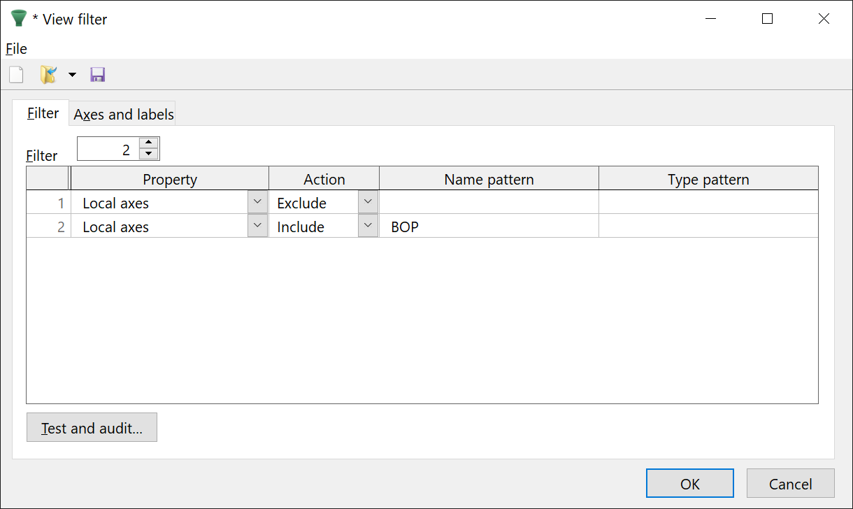 It is worth taking a bit of time to break down this filter, as this is the first time we have had multiple items. Filter items are applied sequentially. So when we said above that we would first exclude all local axes, and then include them for the BOP, the filter represents these sequential steps exactly: