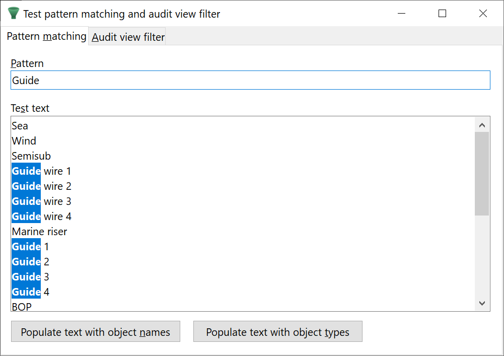 This is because there are extra objects which have Guide in their name, and the filter Guide will match all of them. We can investigate this again with the test view filter form, but this time using the pattern matching page. Here we can use the populate text with object names button to get the list of all object names in this model added to the test text. Note that we're also matching the guide wire lines that also start with Guide.