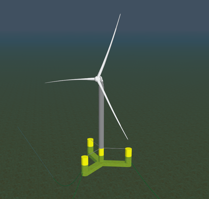Modelling of the semi-submersible foundation has again been supported by OrcaWave, which we have used to perform a diffraction analysis for the UMaine VolturnUS-S semi-submersible. The platform design basis is documented here and the same report details the mooring specification considered for this example.