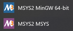 Once you have installed the basic msys2 environment, we next need to install the necessary packages to build our code with MinGW/g++. The msys2 environment provides a number of different command prompts, each one targeted for a specific activity. The prompts that we will use are MSYS and MinGW 64-bit. These are found in your start menu: