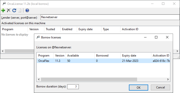 The borrow licenses dialog lists all the Orcina licenses on your license server available to borrow. Select the license you require from the list, set the number of days you wish to borrow it for, and press OK: OrcaLicense will download the license from your license server and save it to your machine's trusted storage.