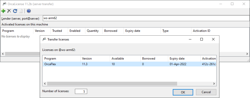 Select the license you require from the list, specify how many licenses to transfer, and press OK: OrcaLicense will transfer the license from the lending server and save them to your machine's trusted storage.